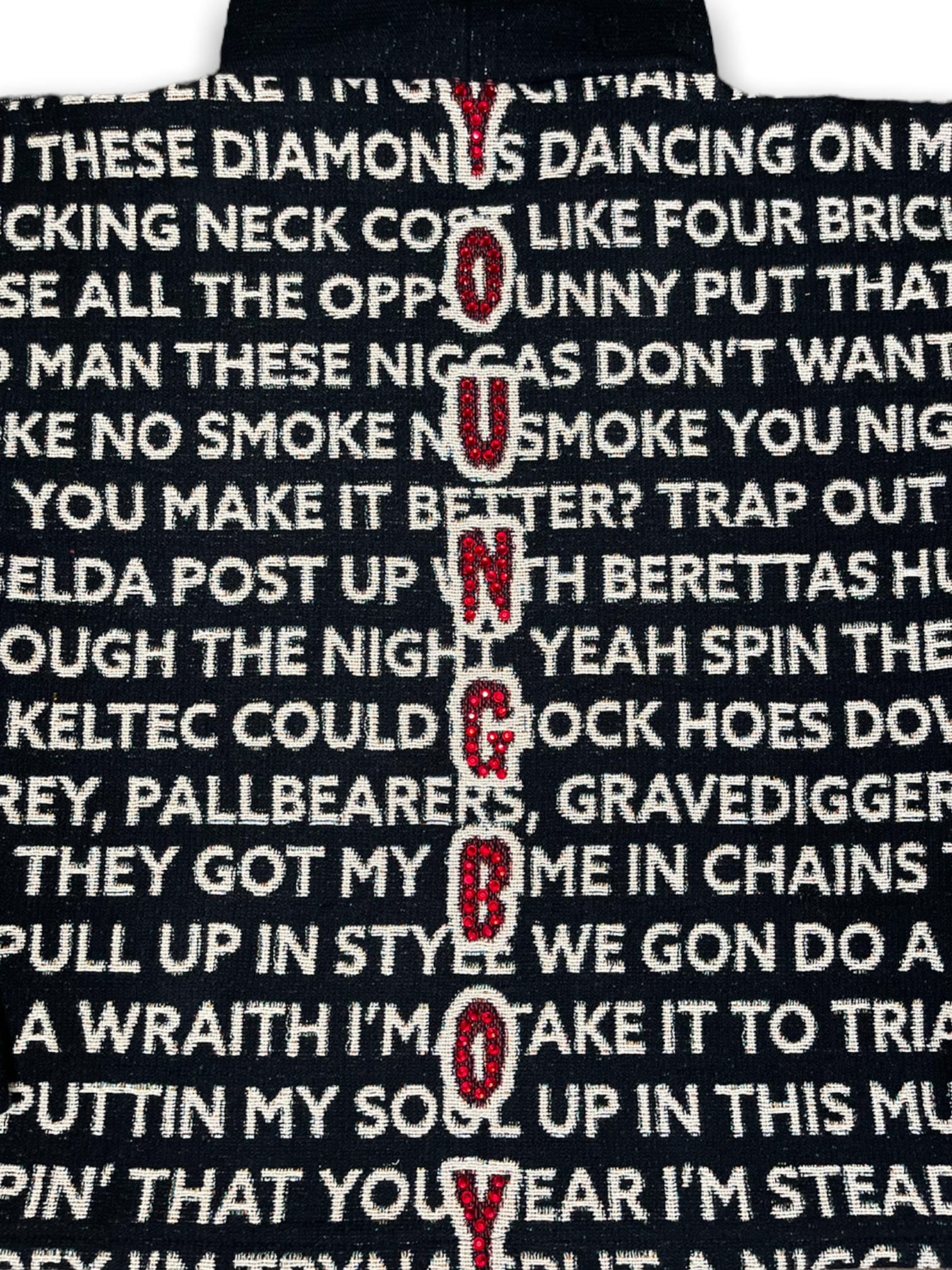 1 of 1 creator designed hoodie featuring artist collage, various song lyrics, sleeve text, and rhinestone!